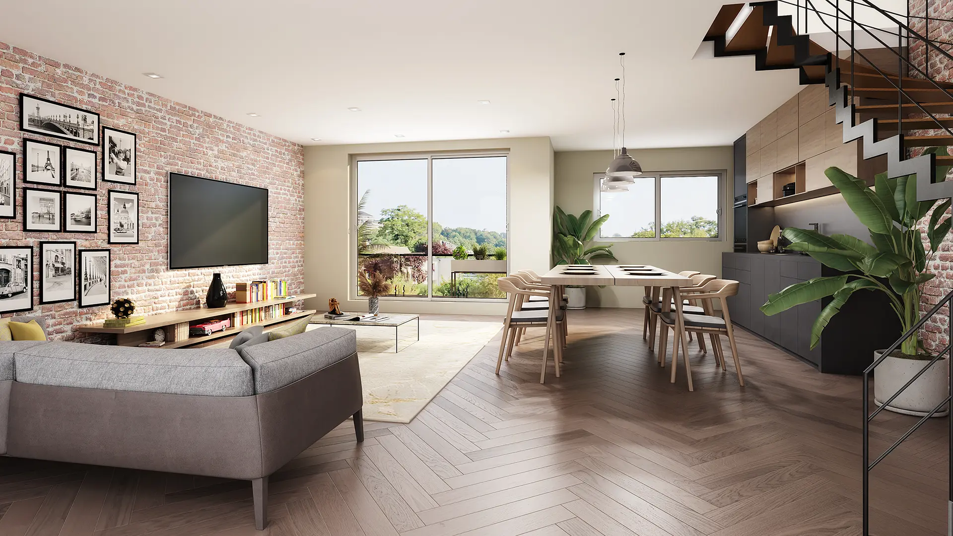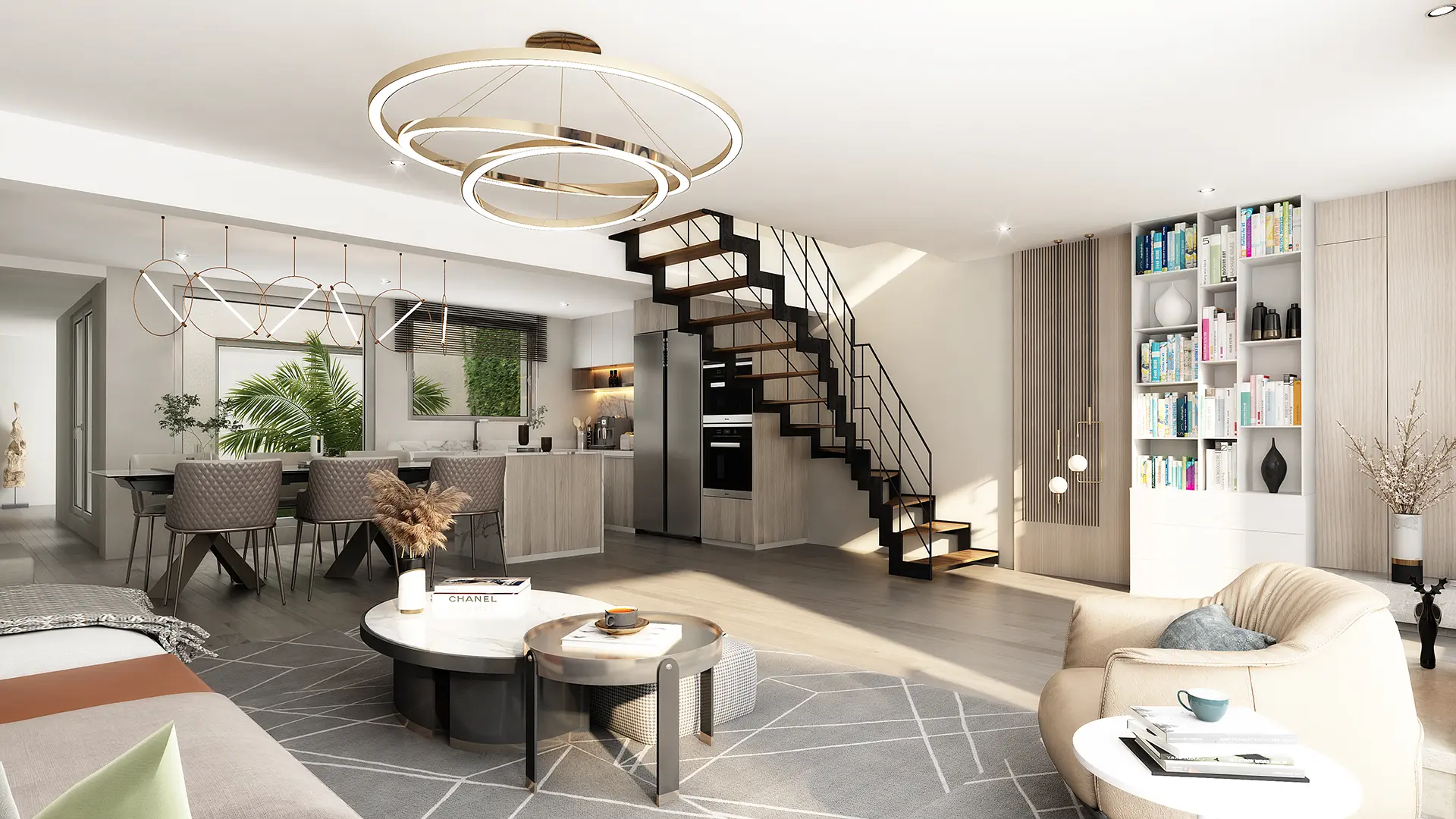 - Penthouse Luxury: The penthouse visualization emphasized open-concept living, large windows, premium finishes (like wide-plank wood flooring and glass railings), and the integration of a custom internal staircase. The staging focused on luxury and seamless indoor-outdoor flow.