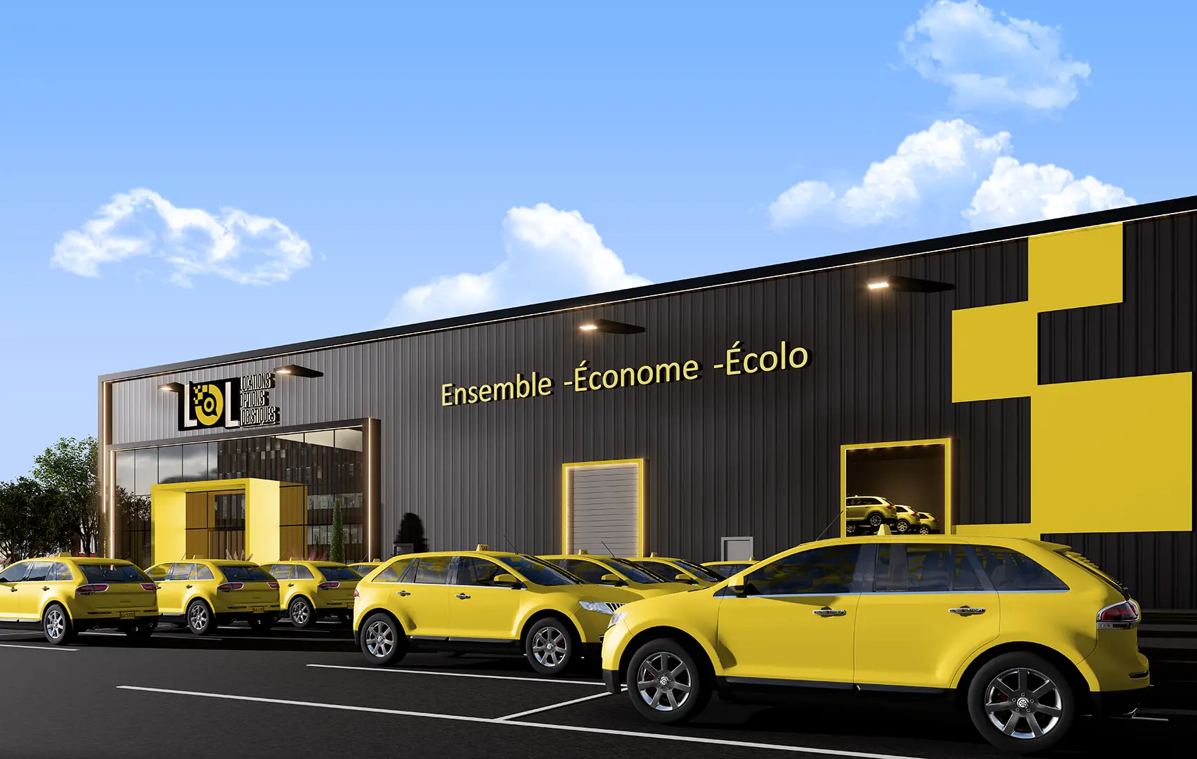 The client needed high-impact exterior architectural visualization to showcase the new building’s design. The key requirement was to seamlessly integrate their distinct corporate branding—bold yellow and black—into the structure itself, ensuring the facility served as both a functional logistics hub and a powerful marketing asset. They required visuals that clearly communicated the building’s identity to investors and city planners.